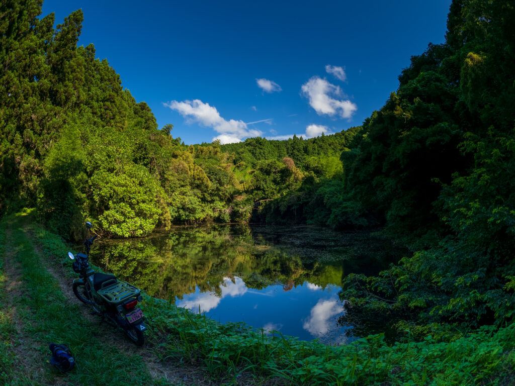 中腹には用水池がありまして、見事な藍色をたたえています。この時期は蜻蛉やトンボも沢山居て、ゆらりゆらりと漂う姿は何とものどかです。ゆっくりしたいところですが、日陰は蚊も多いので、滅多に来ないごちそうになる前に退散しました。