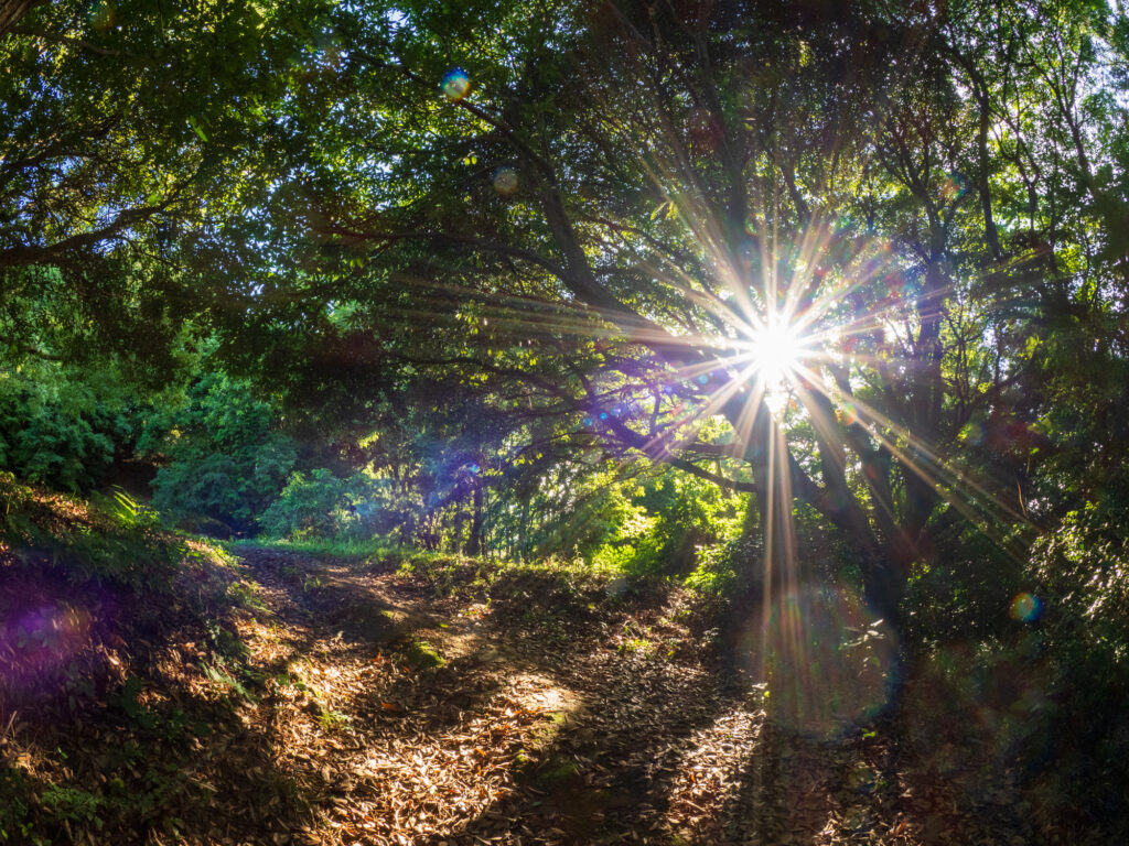 The trail is comfortably shaded by trees. Although the sunlight is strong, depending on the angle at which it filters through the canopy, it creates beautiful rays of light that delight the eyes. This might be one of the true pleasures of climbing Mt. Shintateyama in the height of summer.