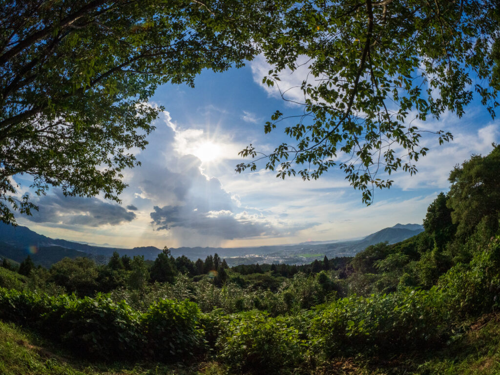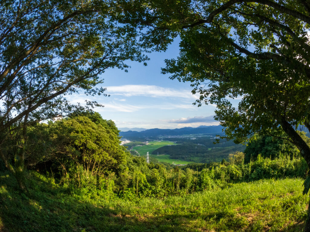 こちらは宮若方面の眺望ですが、田畑が広がってのんびりした感じです。トヨタ自動車九州の工場群も見ることができるのですが、この日は草木が茂りすぎて見えにくかったです。レクサスを生産する工場と田園風景は、一見、ミスマッチのようにも感じますが、これも日本らしい調和なのかもしれません。